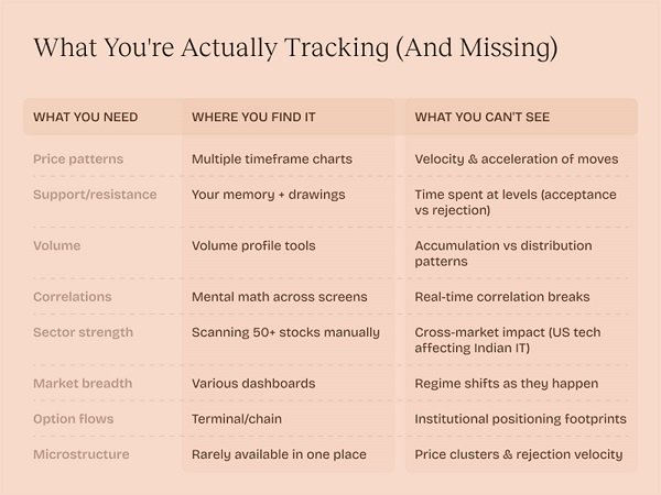 Institutional trading desks employ entire teams. One person watches correlations. Another tracks order flows. Someone else manages risk. Individual traders attempt everything alone with tools that haven’t fundamentally changed since the 1990s. Half the market operates invisibly. Velocity shifts predict momentum changes before they happen. Acceleration patterns signal reversals. Microstructure dynamics reveal whether selling represents accumulation or genuine distribution. These aren’t improvements to existing charts. They’re entirely different dimensions of market reality that require purpose-built systems to reveal. Take Thursday morning analyzing banking stocks. The traditional approach: check five tickers individually, compare RSI values, scan volume patterns, examine formations across timeframes, scramble through option chains. Thirty minutes later, you’ve missed the correlation break about to drive the entire sector. Now imagine a single conversation revealing HDFC’s velocity accelerating while ICICI’s momentum decelerates. Spotting accumulation patterns invisible on standard charts. Connecting overnight US banking weakness to specific impacts on Indian private banks versus PSUs. Not better analysis of what you see–revelation of what was always there.